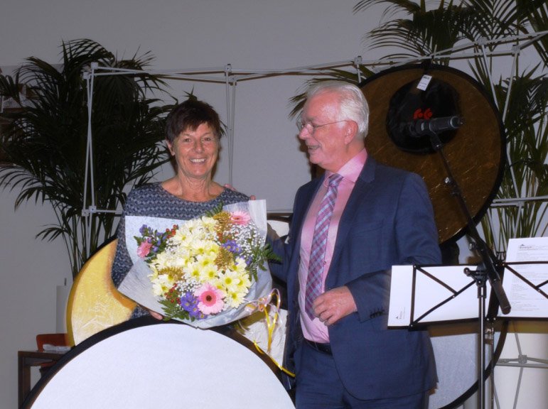 De prijswinnaars ontvingen allen een boeket bloemen en een reflectie scherm. Kees overhandigde de schermen met de ‘opdracht’ om ter plaatse het scherm in het bij behorende etui te doen! En dat was nog niet zo simpel.
